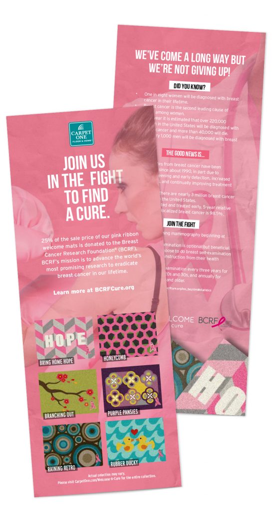 We worked with our client Carpet One Floor & Home to create a member driven promotional campaign to promote their Carpet One Welcomes Your Support to end breast cancer. This multi year program raises fund and awareness to benefit the Breast Cancer Research Foundation. This is one year’s create assets that were provided to members to promote the program in their local market. The campaign included in-store signage, brochures, emails, counter cards and newspaper ads as well as multiple launch videos targeted to member retailers.